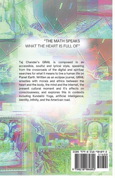 Taj Chander's GRAIL is a collection of "road poems" composed in an accessible, soulful and lyrical style. GRAIL speaks from the crossroads of the digital and spiritual searches for what it means to live a human life on Planet Earth. Written as an eclipse journal, the poems wrestle with morals and ethics between the heart and the body, the mind and the internet, the present cultural moment and it's effects on consciousness; and explores this in contexts including Kundalini Yoga, artificial intelligence, identity, infinity, and the American road.