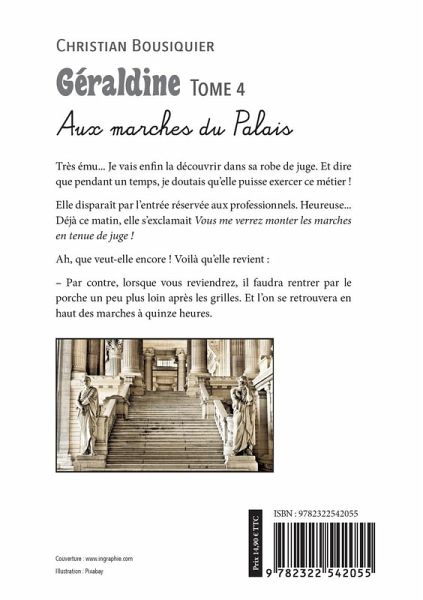 Très ému... Je vais enfin la découvrir dans sa robe de juge. Et dire que pendant un temps, je doutais qu'elle puisse exercer ce métier !Elle disparaît par l'entrée réservée aux professionnels. Heureuse...Déjà ce matin, elle s'exclamait Vous me verrez monter les marches en tenue de juge !Ah, que veut-elle encore ! Voilà qu'elle revient :- Par contre, lorsque vous reviendrez, il faudra rentrer par le porche un peu plus loin après les grilles. Et l'on se retrouvera en haut des marches à quinze heures.