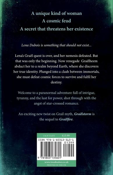 Graëlstorm A unique kind of woman A cosmic feud A secret that threatens her existence Lena Dubois is something that should not exist... Lena's Graël quest is over, and her nemesis defeated. But that was only the beginning. Now renegade Graëlheem abduct her to a realm beyond Earth, where she discovers her true identity. Plunged into a clash between immortals, she must defeat cosmic forces to survive and fulfil her destiny. Welcome to a paranormal adventure full of intrigue, tyranny, and the lust for power, shot through with the angst of star-crossed romance. An exciting new twist on Grail myth, Graëlstorm is the sequel to Graëlfire