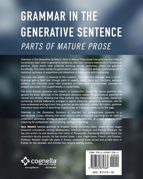 Grammar in the Generative Sentence: Parts of Mature Prose shows how grammar and rhetoric complement each other in generative sentences, with their multiple statements in hierarchical patterns. Some books have collected stunning sample sentences; others are grammar handbooks. This book reveals the grammatical constituents of fine writing, culminating with a statistical summary of proportions and placement of statements within sentences. This book was written in response to the question, “How does the language work in print?” Grammar gets a fresh look through parts of speech, verbs, forms and functions, sentence patterns, and discourse units—with emphasis on those used nonrestrictively. Samples for analysis are drawn from superb writers in varied fields. The bond between grammar and rhetoric is indissoluble, though the typical grammar text ignores the bond. Grammar in the Generative Sentence reveals the grammatical assembly of clauses and phrases, showing how they combine into rhetorically stunning prose. Sentences containing multiple statements arranged in logical hierarchy—generative sentences—are far more widespread and significant than grammar guides ordinarily confess. By custom, grammar instruction stops short of describing English prose as it actually shows up on the page. Grammar in the Generative Sentence is intended for undergraduate students in a one-semester course, allowing that some need to start at the very beginning but all need to understand generative writing. It consists of text with exercises, at a level suited to those preparing for professional work in writing, editing, or teaching.
