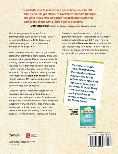 Your best offense against the state assessments No matter what state you teach in, you can be certain that grammar is being tested . . . frequently and across the grades! The biggest issue? Most of our grades 4-12 students continue to make the same old errors year after year. Grammar Keepers to the rescue, with 101 lessons that help students internalize the conventions of correctness once and for all. Bernabei’s key ingredients include Daily journal writing to increase practice and provide an authentic context Minilessons and Interactive Dialogues that model how to make grammatical choices A "Keepers 101" sheet to track teaching and "Parts of Speech Sheet" for student reference