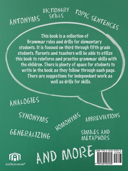 This book is a collection of Grammar rules and drills for elementary students. It is focused on third through fifth grade students. Parents and teachers will be able to utilize this book to reinforce and practice grammar skills with the children. There is plenty of space for students to write in the book as they follow through each page. There are suggestions for independent work as well as drills for skills.