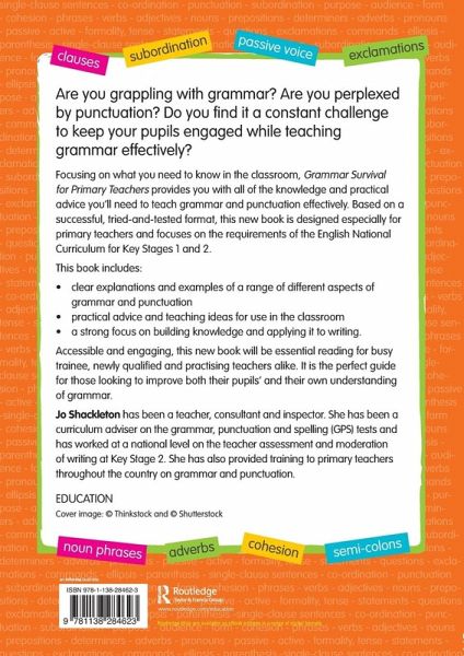 Are you grappling with grammar? Are you perplexed by punctuation? Do you find it a constant challenge to keep your pupils engaged while teaching grammar effectively? Focusing on what you need to know in the classroom, Grammar Survival for Primary Teachers provides you with all of the knowledge and practical advice you'll need to teach grammar and punctuation effectively. Based on a successful, tried-and-tested format, this new book is designed especially for primary teachers and focuses on the requirements of the English National Curriculum for Key Stages 1 and 2. This book includes: clear explanations and examples of a range of different aspects of grammar and punctuation practical advice and teaching ideas for use in the classroom a strong focus on building knowledge and applying it to writing. Accessible and engaging, this new book will be essential reading for busy trainee, newly qualified and practising teachers alike. It is the perfect guide for those looking to improve both their pupils' and their own understanding of grammar.