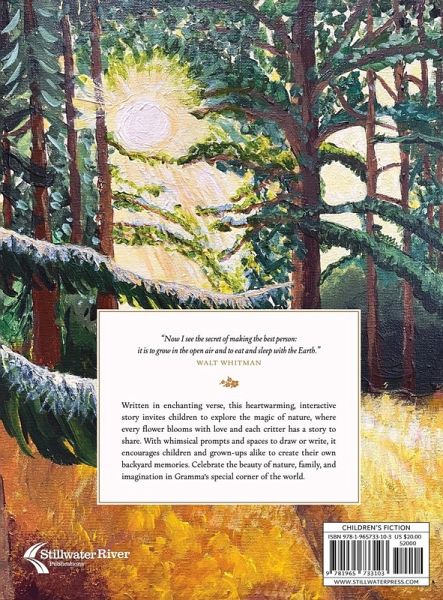 "Now I see the secret of making the best person: it is to grow in the open air and to eat and sleep with the Earth." -Walt Whitman Written in enchanting verse, this heartwarming, interactive story invites children to explore the magic of nature, where every flower blooms with love and each critter has a story to share. With whimsical prompts and spaces to draw or write, it encourages children and grown-ups alike to create their own backyard memories. Celebrate the beauty of nature, family, and imagination in Gramma's special corner of the world.