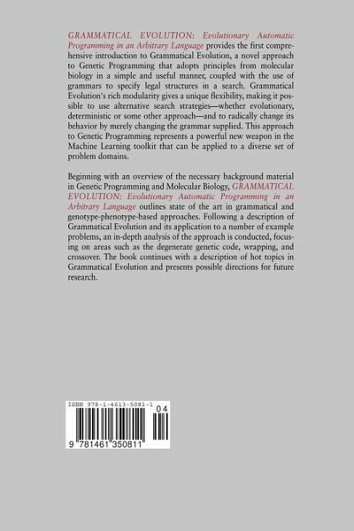 Grammatical Evolution: Evolutionary Automatic Programming in an Arbitrary Language provides the first comprehensive introduction to Grammatical Evolution, a novel approach to Genetic Programming that adopts principles from molecular biology in a simple and useful manner, coupled with the use of grammars to specify legal structures in a search. Grammatical Evolution's rich modularity gives a unique flexibility, making it possible to use alternative search strategies - whether evolutionary, deterministic or some other approach - and to even radically change its behavior by merely changing the grammar supplied. This approach to Genetic Programming represents a powerful new weapon in the Machine Learning toolkit that can be applied to a diverse set of problem domains.