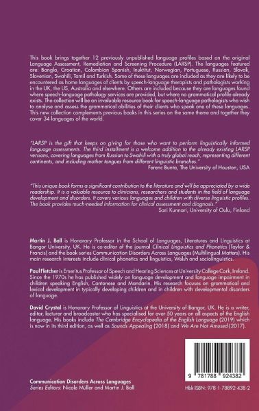 This collection brings together language profiles of the Language Assessment Remediation and Screening Procedure (LARSP) from 12 languages around the world. It will be an invaluable resource for speech-language pathologists in many countries and for those wishing to analyse the grammatical abilities of clients of many linguistic backgrounds.