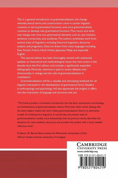 This is a general introduction to grammaticalization, the change whereby lexical terms and constructions come in certain linguistic contexts to serve grammatical functions, and, once grammaticalized, continue to develop new grammatical functions. The authors synthesize work from several areas of linguistics, including historical linguistics, discourse analysis, and pragmatics. Data are drawn from many languages including Ewe, Finnish, French, Hindi, Hittite, Japanese, Malay, and especially English. This 2003 second edition has been thoroughly revised with substantial updates on theoretical and methodological issues that have arisen in the decade since the first edition, and includes a significantly expanded bibliography. Particular attention is paid to recent debates over directionality in change and the role of grammaticalization in creolization. Grammaticalization will be a valuable and stimulating textbook for all linguists interested in the development of grammatical forms and will also be of interest to readers in anthropology and psychology.