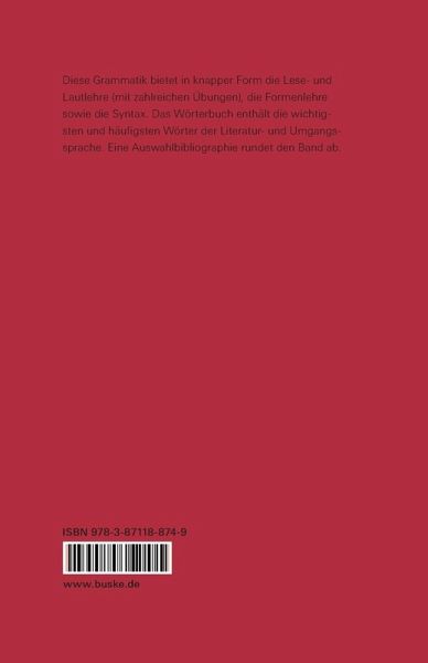 Diese Grammatik bietet in knapper Form die Lese- und Lautlehre (mit zahlreichen Übungen), die Formenlehre sowie die Syntax. Das Wörterbuch enthält die wichtigsten und häufigsten Wörter der Literatur- und Umgangsprache. Eine Auswahlbibliographie rundet den Band ab.