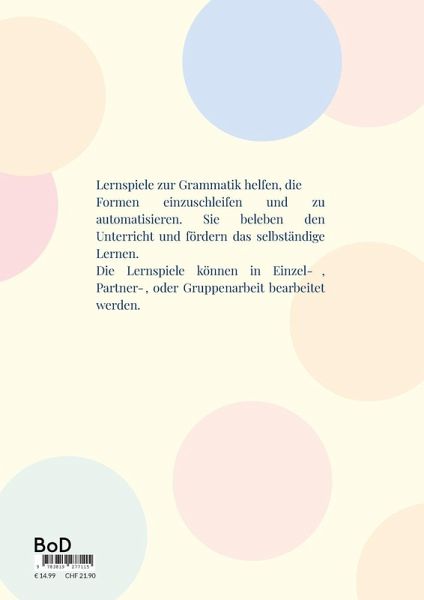 Lernspiele zur Grammatik helfen, die Formen einzuschleifen und zu automatisieren. Sie beleben den Unterricht und fördern das selbständige Lernen. Die Lernspiele können in Einzel-, Partner-, oder Gruppenarbeit bearbeitet werden.