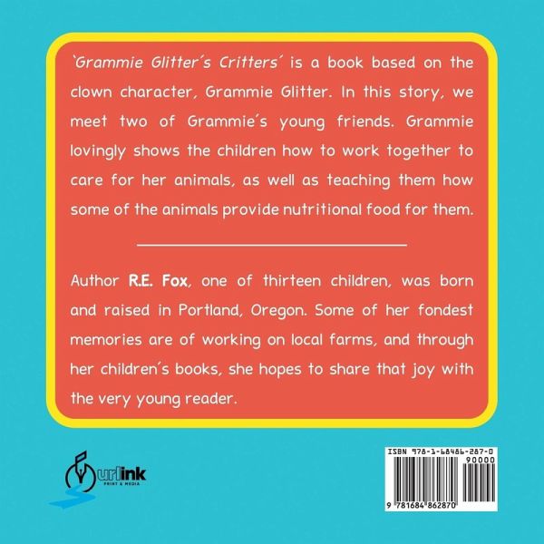 'Grammie Glitter's Critters' is a book based on the clown character, Grammie Glitter. In this story, we meet two of Grammie's young friends. Grammie lovingly shows the children how to work together to care for her animals, as well as teaching them how some of the animals provide nutritional food for them.
