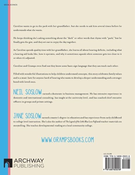Caroline wants to go to the park with her grandfather, but she needs to ask him several times before he understands what she wants. He keeps thinking she's asking something about the "dark" or other words that rhyme with "park," but he finally gets the gist, and they set out to enjoy the day together. As Caroline spends quality time with her grandfather, she learns all about hearing deficits, including what a hearing aid looks like, how it operates, and why it sometimes squeals when someone gets too close to it or when it's adjusted. Caroline and Gramps even find out they know some basic sign language that they can teach each other. Filled with wonderful illustrations to help children understand concepts, this story celebrates family values and is a must-have for anyone hard of hearing who wants to develop a deeper understanding and a stronger bond with loved ones.