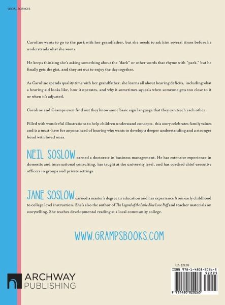 Caroline wants to go to the park with her grandfather, but she needs to ask him several times before he understands what she wants. He keeps thinking she's asking something about the "dark" or other words that rhyme with "park," but he finally gets the gist, and they set out to enjoy the day together. As Caroline spends quality time with her grandfather, she learns all about hearing deficits, including what a hearing aid looks like, how it operates, and why it sometimes squeals when someone gets too close to it or when it's adjusted. Caroline and Gramps even find out they know some basic sign language that they can teach each other. Filled with wonderful illustrations to help children understand concepts, this story celebrates family values and is a must-have for anyone hard of hearing who wants to develop a deeper understanding and a stronger bond with loved ones.