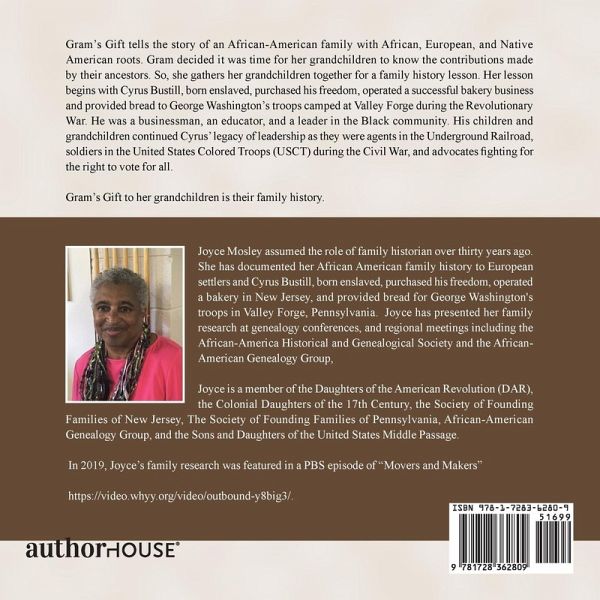 Gram's Gift tells the story of an African-American family with African, European, and Native American roots. Gram decided it was time for her grandchildren to know the contributions made by their ancestors. So, she gathers her grandchildren together for a family history lesson. Her lesson begins with Cyrus Bustill, born enslaved, purchased his freedom, operated a successful bakery business and provided bread to George Washington's troops camped at Valley Forge during the Revolutionary War. He was a businessman, an educator, and a leader in the Black community. His children and grandchildren…mehr