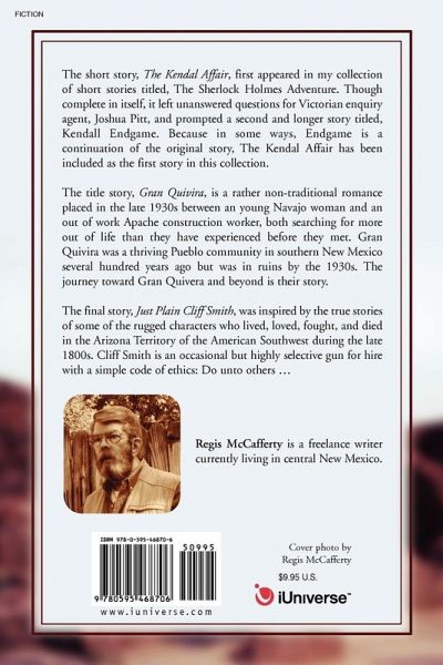 The short story, The Kendal Affair, first appeared in my collection of short stories titled, The Sherlock Holmes Adventure. Though complete in itself, it left unanswered questions for Victorian enquiry agent, Joshua Pitt, and prompted a second and longer story titled, Kendall Endgame. Because in some ways, Endgame is a continuation of the original story, The Kendal Affair has been included as the first story in this collection. The title story, Gran Quivira, is a rather non-traditional romance placed in the late 1930s between an young Navajo woman and an out of work Apache construction worker, both searching for more out of life than they have experienced before they met. Gran Quivira was a thriving Pueblo community in southern New Mexico several hundred years ago but was in ruins by the 1930s. The journey toward Gran Quivera and beyond is their story. The final story, Just Plain Cliff Smith, was inspired by the true stories of some of the rugged characters who lived, loved, fought, and died in the Arizona Territory of the American Southwest during the late 1800s. Cliff Smith is an occasional but highly selective gun for hire with a simple code of ethics: Do unto others....