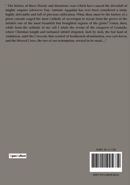 " The history of those bloody and disastrous wars which have caused the downfall of mighty empires (observes Fray Antonio Agapida) has ever been considered a study highly delectable and full of precious edification. What, then, must be the history of a pious crusade waged the most Catholic of sovereigns to rescue from the power of the infidels one of the most beautiful but benighted regions of the globe? Listen, then, while from the solitude of my cell I relate the events of the conquest of Granada, where Christian knight and turbaned infidel disputed, inch by inch, the fair land of Andalusia, until the Crescent, that symbol of heathenish abomination, was cast down, and the blessed Cross, the tree of our redemption, erected in its stead....."