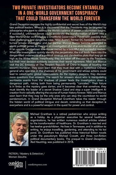 Grand Deception exposes the highly confidential and secret lives of the World's top two political leaders. When it is discovered that the Presidents may be targeted by adversaries who want to destroy the World's balance of power, a countdown begins. If successful, unknown forces could accelerate the transformation of Earth into a New World Order controlled by a OneWorld Government. Faced with possibly their most challenging and dangerous case, Nikki Austen, former DC homicide detective turned private investigator and her partner Marcus Bianco become entangled in world political games as they join an investigation of a macabre murder of an escort in an upscale Georgetown townhouse owned by a beautiful and successful madam. When the investigators quickly identify the perpetrator, the trail leads them into the danger-filled underworld of a political coverup and clandestine plots that may go as high as the White House. Inexplicably, they are taken off the case by the President, but their next decision suddenly becomes their worst nightmare. Nikki and Marcus visit the DC Embassy of The People's Republic of China in hopes of locating the escort's murderer. They soon learn that they must deal with a mysterious Chinese general who operates in the shadows of his government and whose actions could lead to catastrophic global repercussions. As the mystery deepens, they discover more questions than answers. The search for answers about who is manipulating worldwide events from the shadows of power leads the investigators down a dangerous path, risking both from being permanently "canceled." Their future is in limbo as the mystery goes darker, and it becomes clear that somehow, they must identify the leader of a secret Shadow Cabal and stop a super intelligent AI creation from radically altering the course of human history forever. Nikki and Marcus soon learn that they may be the only ones who can stop the countdown to world pandemonium. In Grand Deception Michael Grantham takes the reader through the hidden world of political intrigue and deceit, reminding us that deception is everywhere and is a powerful weapon in the quest for power and control.