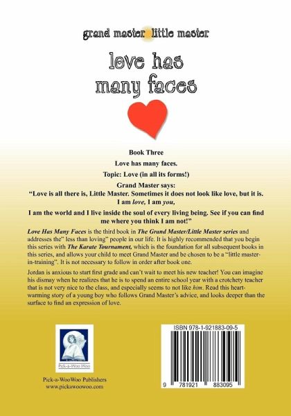 Love Has Many Faces is the third book in The Grand Master/Little Master series and addresses the" less than loving" people in our life. It is highly recommended that you begin this series with The Karate Tournament, which is the foundation for all subsequent books in this series, and allows your child to meet Grand Master and be chosen to be a "little master-in-training". It is not necessary to follow in order after book one. Jordan is anxious to start first grade and can't wait to meet his new teacher! You can imagine his dismay when he realizes that he is to spend an entire school year with a crotchety teacher that is not very nice to the class, and especially seems to not like him. Read this heart-warming story of a young boy who follows Grand Master's advice, and looks deeper than the surface to find an expression of love. Included with this story are three letters from Grand Master to your child with weekly lessons to inspire thought, conversation, and action.