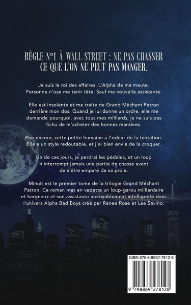 Règle Numéro Un à Wall Street : ne pas tomber amoureuse de son patron milliardaire. Je hais mon patron. Le magnat de Wall Street est un con. Un véritable alpha-bruti. Beau à se damner, mais bourré de défauts. Le genre d'homme jamais content, aimable comme une porte de prison et riche comme Crésus. J'en ai connu, des brutes dans son genre, à la fac, alors il ne me fait pas peur. Ce qui m'inquiète, c'est mon attirance pour lui. Le fait que j'aime argumenter avec lui. Nos luttes verbales. Son expression insondable ensuite. Cet homme est le danger incarné, sous une grosse dose de pouvoir, et j'ai de plus en plus de mal à lui résister. Je hais ma nouvelle assistante. Je les déteste toujours, mais avec elle, ma haine est différente. Tortueuse. Elle est brillante, ultra-compétente et insolente. Et cette petite humaine a l'odeur de la tentation. La pire qui soit. Elle a un style redoutable, et je risque d'être sa première victime. Un de ces jours, elle me poussera à bout. Et elle ne réalise pas ce qui arrive quand on jette un loup alpha sur sa proie. Minuit est le premier tome de la trilogie Grand Méchant Patron. Ce roman met en vedette un loup-garou milliardaire et hargneux et son assistante incroyablement intelligente.