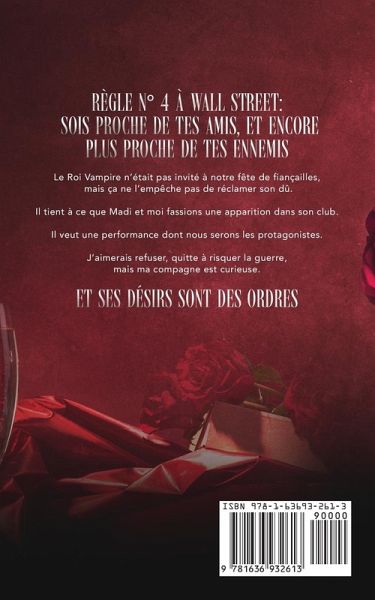 Règle N° 4 à Wall Street : Sois proche de tes amis, et encore plus proche de tes ennemis Le Roi Vampire n'était pas invité à notre fête de fiançailles, mais ça ne l'empêche pas de réclamer son dû. Il tient à ce que Madi et moi fassions une apparition dans son club. Il veut une performance dont nous serons les protagonistes. J'aimerais refuser, quitte à risquer la guerre, mais ma compagne est curieuse. Et ses désirs sont des ordres