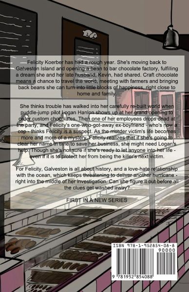 An Idyllic Chocolate Shop. An island with dramatic weather. And a murder. Welcome to Greetings and Felicitations! It is Felicity Koerber's bean to bar chocolate factory/shop - and her refuge from the pain in her past. When she returned home to open it, she never imagined she'd be solving a murder - but now she will have to, to save her business's reputation and avoid being framed as a killer. Felicity Koerber has had a rough year. She's moving back to Galveston Island and opening a bean to bar chocolate factory, fulfilling a dream she and her late husband, Kevin, had shared. Craft chocolate means a chance to travel the world, meeting with farmers and bringing back beans she can turn into little blocks of happiness, right close to home and family. She thinks trouble has walked into her carefully re-built world when puddle-jump pilot Logan Hanlon shows up at her grand opening to order custom chocolates. Then one of her employees drops dead at the party, and Felicity's one-who-got-away ex-boyfriend - who's now a cop - thinks Felicity is a suspect. As the murder victim's life becomes more and more of a mystery, Felicity realizes that if she's going to clear her name in time to save her business, she might need Logan's help. Though she's not sure if she's ready to let anyone into her life - even if it is to protect her from being the killer's next victim. For Felicity, Galveston is all about history, and a love-hate relationship with the ocean, which keeps threatening to deliver another hurricane - right into the middle of her investigation. Can she figure it out before all the clues get washed away? Cozy mystery with a little sweet romance...and a lot of chocolate. FIRST IN A NEW SERIES The author of the Chocoverse science fiction series brings you a brand new adventure inspired by real-life chocolate makers.