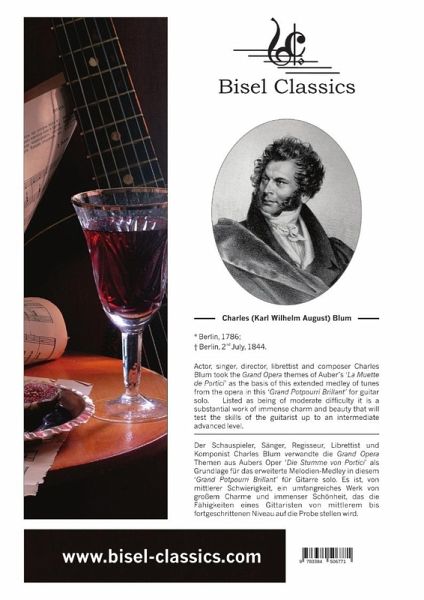Der Schauspieler, Sänger, Regisseur, Librettist und Komponist Charles Blum verwandte die Grand Opera Themen aus Aubers Oper 'Die Stumme von Portici' als Grundlage für das erweiterte Melodien-Medley in diesem 'Grand Potpourri Brillant' für Gitarre solo. Es ist, von mittlerer Schwierigkeit, ein umfangreiches Werk von großem Charme und immenser Schönheit, das die Fähigkeiten eines Gitarristen von mittlerem bis fortgeschrittenen Niveau auf die Probe stellen wird.------------Actor, singer, director, librettist and composer Charles Blum took the Grand Opera themes of Auber's 'La Muette de Portici' as the basis of this extended medley of tunes from the opera in this 'Grand Potpourri Brillant' for guitar solo. Listed as being of moderate difficulty it is a substantial work of immense charm and beauty that will test the skills of the guitarist up to an intermediate advanced level.