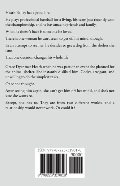 Heath Bailey has a good life. He plays professional baseball for a living, his team just recently won the championship, and he has amazing friends and family. What he doesn't have is someone he loves. There is one woman he can't seem to get off his mind, though. In an attempt to see her, he decides to get a dog from the shelter she runs. That one decision changes his whole life. Grace Dyer met Heath when he was part of an event she planned for the animal shelter. She instantly disliked him. Cocky, arrogant, and unwilling to do the simplest tasks. Or so she thought. After seeing him again, she can't get him off her mind, and she's not sure she wants to. Except, she has to. They are from two different worlds, and a relationship would never work. Or could it?