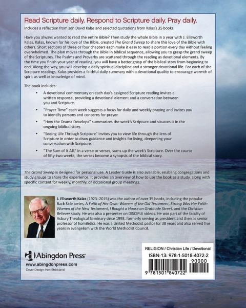 Study the whole Bible in a year with J. Ellsworth Kalas. The Grand Sweep: 365 Days from Genesis through Revelation guides adults to read through the Bible in a year, reading three to four chapters daily. The Psalms and Proverbs are scattered throughout the reading as devotional elements. Because the plan moves through the Bible in biblical sequence, readers grasp the grand weep of the Scriptures--something missed in most Bible studies that take up only a certain book or section of the Bible. Also, daily readings are manageable; someone who is just beginning a serious devotional life need not feel threatened or inadequate. By the time readers finish their year of reading, they will have a grasp of the biblical story from beginning to end. And with it, because of the daily discipline, a stronger devotional life. Kalas also provides a faithful daily summary of each day's reading, but with a devotional quality to encourage warmth of spirit as well as knowledge of mind. Congregations, study groups, and individuals can begin The Grand Sweep at any time during the year with this study. Allow at least 30 minutes daily when using this resource. Includes selected quotations from Kalas's 35 books. The book includes: Questions or directions and daily devotional summary/commentary for Days 1-7 each week call for written response to the assigned Scripture and provide a devotional element. "Prayer Time" suggests a focus for daily and weekly praying and invites you to identify persons and concerns for prayer. "How the Drama Develops" summarizes the week's Scripture and situates it in the ongoing biblical story. "Seeing Life Through Scripture" invites you to view life through the lens of Scripture in order to draw guidance and insights for living. Think of yourself in conversation with Scripture. "The Sum of It All" in a verse or verses, sums up the week's Scripture. Over the course of fifty-two weeks, the verses become a synopsis of the biblical story. The Grand Sweep is designed for personal use. The added component of a Leader Guide enables congregations and study groups to share the experience. It provides an overview of how to use the book as a study, along with specific content for weekly, monthly, or occasional group meetings.