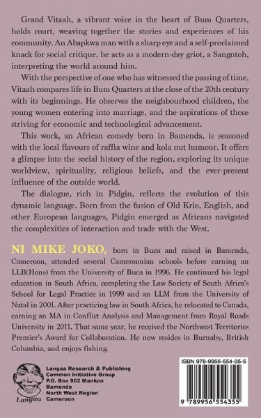 Grand Vitaah, a vibrant voice in the heart of Bum Quarters, holds court, weaving together the stories and experiences of his community. An Abapkwa man with a sharp eye and a self-proclaimed knack for social critique, he acts as a modern-day griot, a Sangntoh, interpreting the world around him. With the perspective of one who has witnessed the passing of time, Vitaah compares life in Bum Quarters at the close of the 20th century with its beginnings. He observes the neighbourhood children, the young women entering into marriage, and the aspirations of those striving for economic and technological advancement. This work, an African comedy born in Bamenda, is seasoned with the local flavours of raffia wine and kola nut humour. It offers a glimpse into the social history of the region, exploring its unique worldview, spirituality, religious beliefs, and the ever-present influence of the outside world. The dialogue, rich in Pidgin, reflects the evolution of this dynamic language. Born from the fusion of Old Krio, English, and other European languages, Pidgin emerged as Africans navigated the complexities of interaction and trade with the West.
