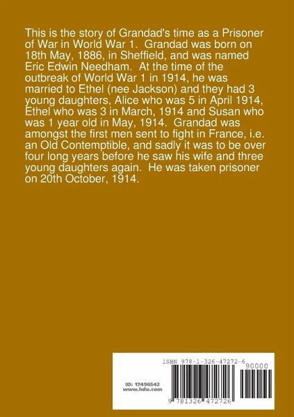 This is the story of Grandad's time as a Prisoner of War in World War 1. Grandad was amongst the first men sent to fight in France, i.e. an Old Contemptible, and sadly it was to be over four long years before he saw his wife and three young daughters again. He was taken prisoner on 20th October, 1914