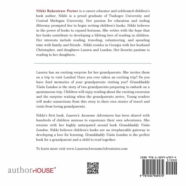 Lauren has an exciting surprise for her grandparents. She invites them on a trip to visit London! Have you ever taken an exciting trip? Do you have fond memories of your grandparents visiting you? Granddaddy Visits London is the story of two grandparents preparing to embark on a spontaneous trip. Children will enjoy reading about the exciting excursion and the surprise waiting when the grandparents arrive. Young readers will make connections from this story to their own stories of travel and visits from loving grandparents. Nikki's first book, Lauren's Awesome Adventures has been shared with hundreds of children anxious to experience their own adventures. She returns with her highly anticipated second book Granddaddy Visits London. Nikki believes children's books are an irreplaceable gateway to developing a love for learning. Granddaddy Visits London is the perfect book for a grandparent and a child to read together. To learn more visit www.LaurensAwesomeAdventures.com