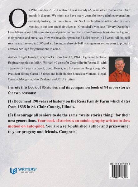 Synopsis: On Palm Sunday 2012, I realized I was already 65 years older than our first two grands in diapers. We might not have many years for heavy adult conversations on family history, fun times, travel, etc. So, I resolved to email two stories every Monday to our sons and their wives as "Granddad's Mondays." Every December, I would take about 120 stories to a local printer to bind them into Christmas books for each grand, their parents, and ourselves. Now we have four grands and 1,516 stories in 12 years. All that will survive me. I retired in 2006 and am having an absolute ball writing in my senior years to proudly create a heritage for generations to come. Author of eight family history books. Born June 12, 1944. Degree in Electrical Engineering plus an MBA. Worked 40 years for Caterpillar in Peoria, IL with 2 patents, 3.5 years in Seoul, South Korea, and 1.5 years in Hong Kong. Met President Jimmy Carter 13 times and built Habitat houses in Vietnam, Nepal, Canada, Mongolia, New Zealand, and 12 U.S. cities. I wrote this book of 85 stories and its companion book of 94 more stories for two reasons: (1) Document 190 years of history on the Reiss Family Farm which dates from 1838 in St. Clair County, Illinois. (2) Encourage all seniors to do the same "write stories thing" for their next generations. Your book of stories is an autobiography written in slow motion on auto-pilot. You are a self-published author and prizewinner to your progeny and friends. Congrats!
