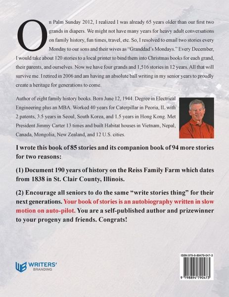 Synopsis: On Palm Sunday 2012, I realized I was already 65 years older than our first two grands in diapers. We might not have many years for heavy adult conversations on family history, fun times, travel, etc. So, I resolved to email two stories every Monday to our sons and their wives as "Granddad's Mondays." Every December, I would take about 120 stories to a local printer to bind them into Christmas books for each grand, their parents, and ourselves. Now we have four grands and 1,516 stories in 12 years. All that will survive me. I retired in 2006 and am having an absolute ball writing in my senior years to proudly create a heritage for generations to come. Author of eight family history books. Born June 12, 1944. Degree in Electrical Engineering plus an MBA. Worked 40 years for Caterpillar in Peoria, IL with 2 patents, 3.5 years in Seoul, South Korea, and 1.5 years in Hong Kong. Met President Jimmy Carter 13 times and built Habitat houses in Vietnam, Nepal, Canada, Mongolia, New Zealand, and 12 U.S. cities. I wrote this book of 85 stories and its companion book of 94 more stories for two reasons: (1) Document 190 years of history on the Reiss Family Farm which dates from 1838 in St. Clair County, Illinois. (2) Encourage all seniors to do the same "write stories thing" for their next generations. Your book of stories is an autobiography written in slow motion on auto-pilot. You are a self-published author and prizewinner to your progeny and friends. Congrats!