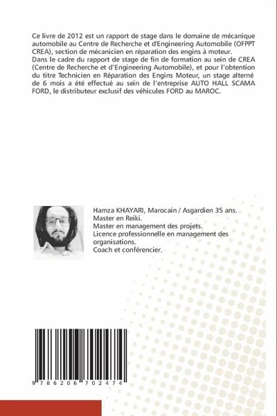 Ce livre de 2012 est un rapport de stage dans le domaine de mécanique automobile au Centre de Recherche et d'Engineering Automobile (OFPPT CREA), section de mécanicien en réparation des engins à moteur.Dans le cadre du rapport de stage de fin de formation au sein de CREA (Centre de Recherche et d'Engineering Automobile), et pour l'obtention du titre Technicien en Réparation des Engins Moteur, un stage alterné de 6 mois a été effectué au sein de l'entreprise AUTO HALL SCAMA FORD, le distributeur exclusif des véhicules FORD au MAROC.
