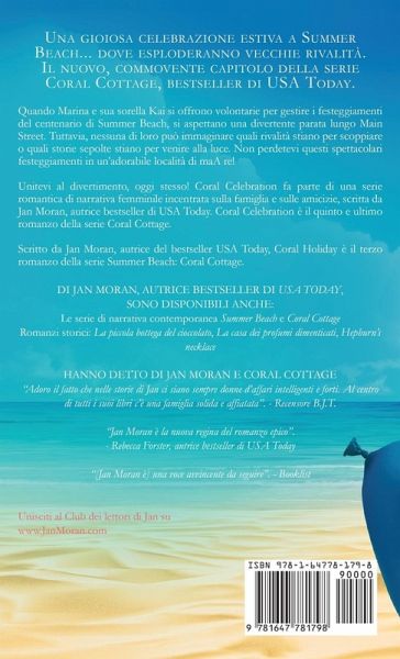 Una gioiosa celebrazione estiva a Summer Beach... dove esploderanno vecchie rivalità.Il nuovo, commovente capitolo della serie Coral Cottage, bestseller di USA Today. Quando Marina e sua sorella Kai si offrono volontarie per gestire i festeggiamenti del centenario di Summer Beach, si aspettano una divertente parata lungo Main Street. Tuttavia, nessuna di loro può immaginare quali rivalità stiano per scoppiare o quali storie sepolte stiano per venire alla luce. Non perdetevi questi spettacolari festeggiamenti in un'adorabile località di maA re! Unitevi al divertimento, oggi stesso! Coral Celebration fa parte di una serie romantica di narrativa femminile incentrata sulla famiglia e sulle amicizie, scritta da Jan Moran, autrice bestseller di USA Today. Coral Celebration è il quinto e ultimo romanzo della serie Coral Cottage. Scritto da Jan Moran, autrice del bestseller USA Today, Coral Holiday è il terzo romanzo della serie Summer Beach: Coral Cottage.