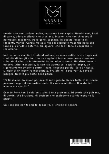 Uomini che non parlano molto, ma sanno farsi capire. Uomini veri, fatti di carne, odore e silenzi che bruciano. Incontri che non chiedono il permesso: accadono, travolgono, segnano. In questa raccolta di racconti, Manuel García mette a nudo il desiderio maschile nella sua forma più cruda e potente, tra sguardi che si sfidano e corpi che si reclamano.Nel racconto che dà il titolo al volume, un uomo solitario si rifugia nei suoi rituali tra gli alberi, in un angolo di bosco dove crede di essere solo. Ma il silenzio è interrotto da un colpo di tosse. Un altro uomo lo osserva. Alto, massiccio, la camicia aperta sulle spalle larghe, un rigonfiamento evidente sotto i jeans. Nessuna parola. Solo un gesto. L'inizio di un incontro inaspettato, brutale nella sua verità, dove il bisogno diventa più forte della paura."Ci fissammo. Nessuno parlava. Il suo sguardo diceva tutto. E io, senza pensare, seguii il suo ordine muto. Il cuore martellava. Il resto del mondo era sparito."Grande Pene non è solo un titolo: è una promessa. Di storie che pulsano, di uomini che bruciano, di desideri che esplodono quando meno te lo aspetti.Un libro che non ti chiede di capire. Ti chiede di sentire.
