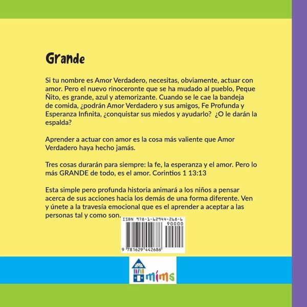 Traducido por la homenajeada de Pura Belpré, Marianna Llanos Si tu nombre es Amor Verdadero, necesitas, obviamente, actuar con amor. Pero el nuevo rinoceronte que se ha mudado al pueblo, Peque Ñito, es grande, azul y atemorizante. Cuando se le cae la bandeja de comida, ¿podrán Amor Verdadero y sus amigos, Fe Profunda y Esperanza Infinita, conquistar sus miedos y ayudarlo? ¿O le darán la espalda? Aprender a actuar con amor es la cosa más valiente que Amor Verdadero haya hecho jamás. Tres cosas durarán para siempre: la fe, la esperanza y el amor. Pero lo más GRANDE de todo, es el amor. Corintios 1 13:13 Esta simple pero profunda historia animará a los niños a pensar acerca de sus acciones hacia los demás de una forma diferente. Ven y únete a la travesía emocional que es el aprender a aceptar a las personas tal y como son. -- When your name is Love Truly, you need to act with, well, love. But the new rhino in town, PeeWee is big, blue, and scary. When he spills his food tray, will Love Truly and her friends, Faith Deep and Hope Big, conquer their fear and step up to help? Or will they turn away? Learning to act with love may be the most courageous thing Love Truly ever does. "Three things will last forever-faith, hope, and love-and the greatest of these is love." I Corinthians 13:13 NLT This simple, yet profound story will challenge kids to think about their actions toward others in new ways. Come along on the emotional journey of learning to accept people who are different from you.