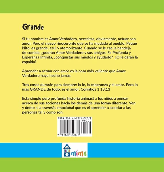 TTraducido por la homenajeada de Pura Belpré, Marianna Llanos Si tu nombre es Amor Verdadero, necesitas, obviamente, actuar con amor. Pero el nuevo rinoceronte que se ha mudado al pueblo, Peque Ñito, es grande, azul y atemorizante. Cuando se le cae la bandeja de comida, ¿podrán Amor Verdadero y sus amigos, Fe Profunda y Esperanza Infinita, conquistar sus miedos y ayudarlo? ¿O le darán la espalda? Aprender a actuar con amor es la cosa más valiente que Amor Verdadero haya hecho jamás. Tres cosas durarán para siempre: la fe, la esperanza y el amor. Pero lo más GRANDE de todo, es el amor. Corintios 1 13:13 Esta simple pero profunda historia animará a los niños a pensar acerca de sus acciones hacia los demás de una forma diferente. Ven y únete a la travesía emocional que es el aprender a aceptar a las personas tal y como son. -- When your name is Love Truly, you need to act with, well, love. But the new rhino in town, PeeWee is big, blue, and scary. When he spills his food tray, will Love Truly and her friends, Faith Deep and Hope Big, conquer their fear and step up to help? Or will they turn away? Learning to act with love may be the most courageous thing Love Truly ever does. "Three things will last forever-faith, hope, and love-and the greatest of these is love." I Corinthians 13:13 NLT This simple, yet profound story will challenge kids to think about their actions toward others in new ways. Come along on the emotional journey of learning to accept people who are different from you.