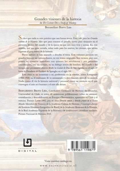 Se dice que nada es m s pr ctico que una buena teor a. Esto vale para las Grandes visiones de la Historia. M s que para conocer el pasado, sirven para situarnos en el presente, dentro del mundo y de la poca en que nos toca vivir y actuar. En este sentido, son una gran escuela, sobre todo para los nuevos, los j venes, que reci n ingresan al gran teatro de la historia. Pocos autores se han animado a abordar el tema. Este volumen presenta sus grandes visiones sin intermediarios, en sus textos originales. Son escasos, pero nos ponen en contacto inmediato con quienes los escribieron y nos permiten introducirnos, casi sin sentirlo, en un di logo acerca del hombre, del mundo y del tiempo, que permanece abierto desde la Ciudad de Dios de San Agust n en el siglo IV hasta la Decadencia de Occidente de Spengler en el siglo XX. Esta obra es un homenaje a mi predecesor en la c tedra, Jaime Eyzaguirre (1908-1968) en el centenario de su nacimiento y a los cuarenta a os de su muert Nadie como l vio la historia universal y personal como un misterio en el que convergen el m s ac humano y el m s all divino.