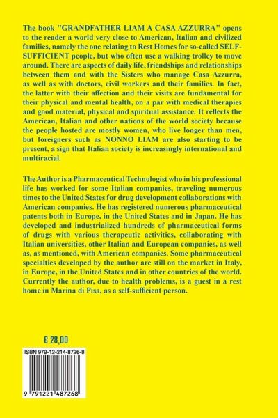 The book "GRANDFATHER LIAM A CASA AZZURRA" opens to the reader a world very close to American, Italian and civilized families, namely the one relating to Rest Homes for so-called SELF-SUFFICIENT people, but who often use a walking trolley to move around. There are aspects of daily life, friendships and relationships between them and with the Sisters who manage Casa Azzurra, as well as with doctors, civil workers and their families. In fact, the latter with their affection and their visits are fundamental for their physical and mental health, on a par with medical therapies and good material, physical and spiritual assistance. It reflects the American, Italian and other nations of the world society because the people hosted are mostly women, who live longer than men, but foreigners such as NONNO LIAM are also starting to be present, a sign that Italian society is increasingly international and multiracial.