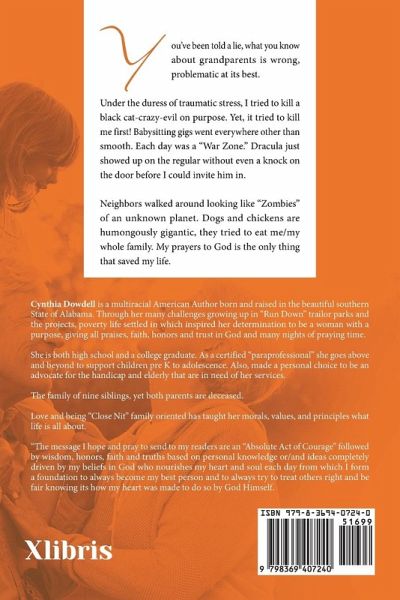 You've been told a lie, what you know about grandparents is wrong, problematic at its best. Under the duress of traumatic stress, I tried to kill a black cat-crazy-evil on purpose. Yet, it tried to kill me first! Babysitting gigs went everywhere other than smooth. Each day was a "War Zone." Dracula just showed up on the regular without even a knock on the door before I could invite him in. Neighbors walked around looking like "Zombies" of an unknown planet. Dogs and chickens are humongously gigantic, they tried to eat me/my whole family. My prayers to God is the only thing that saved my life.