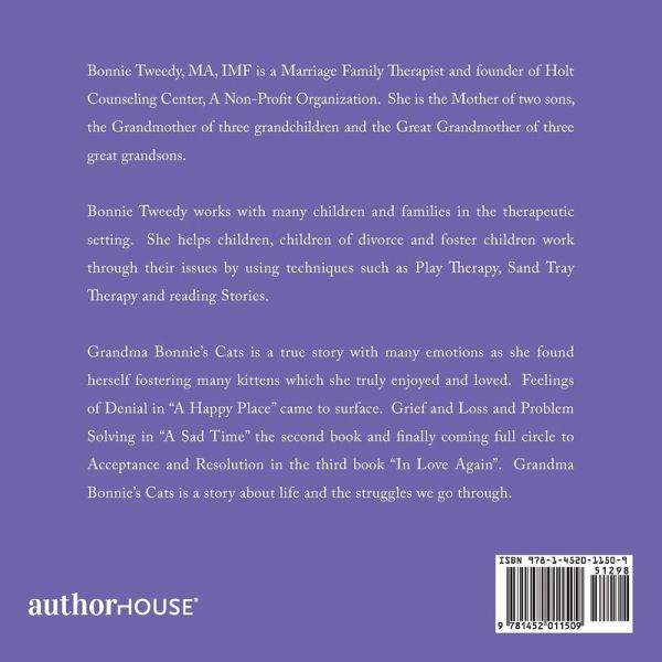 Bonnie Tweedy, MA, IMF is a Marriage Family Therapist and founder of Holt Counseling Center, A Non-Profit Organization. She is the Mother of two sons, the Grandmother of three grandchildren and the Great Grandmother of three great grandsons. Bonnie Tweedy works with many children and families in the therapeutic setting. She helps children, children of divorce and foster children work through their issues by using techniques such as Play Therapy, Sand Tray Therapy and reading Stories. Grandma Bonnie's Cats is a true story with many emotions as she found herself fostering many kittens which she truly enjoyed and loved. Feelings of Denial in "A Happy Place" came to surface. Grief and Loss and Problem Solving in "A Sad Time" the second book and finally coming full circle to Acceptance and Resolution in the third book "In Love Again". Grandma Bonnie's Cats is a story about life and the struggles we go through.