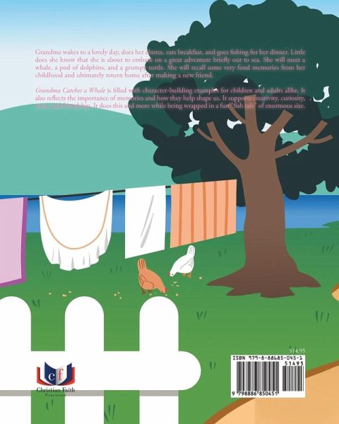 Grandma wakes to a lovely day, does her chores, eats breakfast, and goes fishing for her dinner. Little does she know that she is about to embark on a great adventure briefly out to sea. She will meet a whale, a pod of dolphins, and a grumpy turtle. She will recall some very fond memories from her childhood and ultimately return home after making a new friend. Grandma Catches a Whale is filled with character-building examples for children and adults alike. It also reflects the importance of memories and how they help shape us. It supports creativity, curiosity, trust, and friendship. It does this and more while being wrapped in a fun "fish tale" of enormous size.