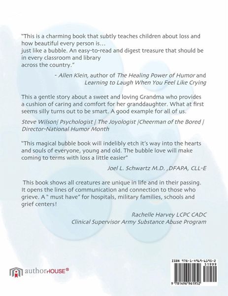 "This is a charming book that subtly teaches children about loss and how beautiful every person is... just like a bubble. An easy-to-read and digest treasure that should be in every classroom and library across the country." - Allen Klein, author of The Healing Power of Humor and Learning to Laugh When You Feel Like Crying This a gentle story about a sweet and loving Grandma who provides a cushion of caring and comfort for her granddaughter. What at first seems silly turns out to be smart. A good example for all of us. Steve Wilson Psychologist The Joyologist Cheerman of the Bored Director-National Humor Month "This magical bubble book will indelibly etch it's way into the hearts and souls of everyone, young and old. The bubble love will make coming to terms with loss a little easier" Joel L. Schwartz M.D. ,DFAPA, CLL-E This book shows all creatures are unique in life and in their passing. It opens the lines of communication and connection to those who grieve. A " must have" for hospitals, military families, schools and grief centers! Rachelle Harvey LCPC CADC Clinical Supervisor Army Substance Abuse Program