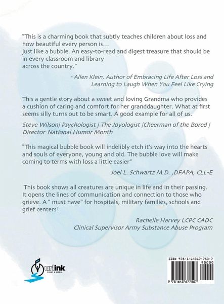 This is a charming book that subtly teaches children about loss and how beautiful every person is. Just like a bubble. An easy-to-read and digest treasure that should be in every classroom and library across the country. - Allen Klein, Author of Embracing Life After Loss and Learning to Laugh When You Fell Like Crying This is a gentle story about a sweet and loving Grandma who provides a cushion of caring and comfort for her granddaughter. What at first seems silly turns out to be smart. A good example for all of us. - Steve Wislon/Psychologist/The Joyologist/Cheerman of the Bored/Director-National Humor Month This magical bubble book will indelibly etch its way into the hearts and souls of everyone, young and old. The bubble love will make coming to terms with loss a little easier. - Joel L. Schwartz M.D., DFAPA, CLL-E This book shows all creatures are unique in life in their passing. It opens the lines of communication and connection and to those who grieve. A must have for hospitals, military families, schools and grief centers! - Rachelle Harvey LCPC CADC Clinical Supervisor Army Substance Abuse Program