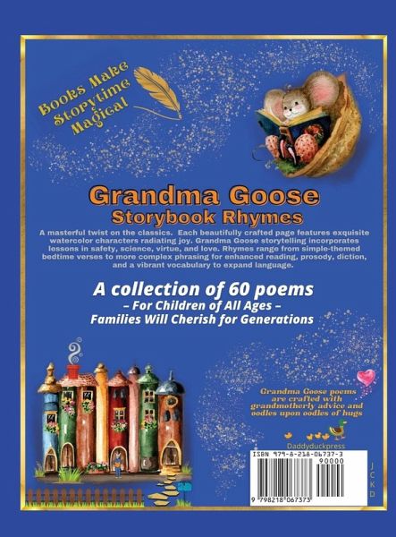 Grandma Goose Storybook Rhymes is a fantastic, fun, money-saving resource. Unlike nursery rhymes from the past, this masterful twist on the classics features much-needed messages of safety, science, virtue, and love that families will cherish for years. Page by page, children are charmed by the old-timey watercolor illustrations as they discover Grandma's valuable lessons that keep kids safe while improving the quality and joyfulness of each day.