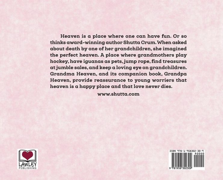 Heaven is a place where one can have fun. Or so thinks award-winning author Shutta Crum. When asked about death by one of her grandchildren, she imagined the perfect heaven. A place where grandmothers play hockey, have iguanas as pets, jump rope, find treasures at jumble sales, and keep a loving eye on grandchildren. Grandma Heaven, and its companion book, Grandpa Heaven, provide reassurance to young worriers that heaven is a happy place and that love never dies.
