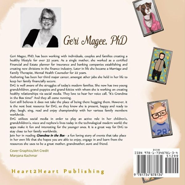 Grandma in the Box is a children's book by Geri Magee, PhD. Grandma in the Box is a snippet from Geri's own life with her own grandchildren. It is a book that teaches how to communicate with your grandchildren over long distances when grandparent's may be unable to visit their grandchildren in person for many and varied reasons. Geri has been working with individuals, couples and families creating a healthy lifestyle for over 32 years. As a single mother, she worked as a certified Financial and Estate planner for insurance and banking companies establishing and creating new divisions in the finance industry. Later in life she became a Marriage and Family Therapist, Mental Health Counselor for 22 years. Authoring has been her third major career, amongst other jobs she held in her life to keep her family financially secure. DrG is well aware of the struggles of today's modern families. She now has two young grandchildren, grand-puppies and grand-kitties with whom she is working on creating healthy relationships via social media. They love to hear her voice call, "It's Grandma in the Box time!" And they all come running. Geri still believes it does not take the place of being there hugging them. However, it is the next best resource for DrG, so they know she is present, happy and ready to play, laugh, sing, read and enjoy championship with her various family members worldwide. DrG utilizes social media in order to play an active role in her children's, grandchildren's, niece and nephew's lives today in the technological modern world; the apps make it fun and interesting for the younger ones. It is a great way for DrG to stay close to her family worldwide. Join her in reading Grandma in the Box - a fun loving story of events that take place in her own life that she hopes you are able to enjoy, engage in and learn from the resources she uses to be a great mother, grandmother, aunt and friend.