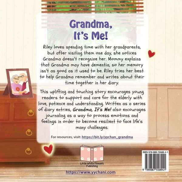 Riley loves spending time with her grandparents, but after visiting them one day, she notices Grandma doesn't recognize her. Mommy explains that Grandma may have dementia, so her memory isn't as good as it used to be. Riley tries her best to help Grandma remember and writes about their time together in her diary. This uplifting and touching story encourages young readers to support and care for the elderly with love, patience and understanding. Written as a series of diary entries, Grandma, It's Me! also encourages journaling as a way to process emotions and feelings in order to become resilient to face life's many challenges. Foreword by Teresa B.K.Tsien, Gerontologist Hong Kong Alzheimer's Disease Association Board Member "Ms. Chan wrote Grandma, It's Me! with experience from her caregiving journey with her grandmother. The story was written with a dash of humor and lots of love from a child's perspective. It helps to take away some of the mystery, and reminds us that even though the disease has changed the mind and body, the person with dementia is still there, and still loves us. She has illustrated an important message that people with dementia might not remember the events, but they will always remember the feelings that they experienced. I highly recommend this book to families and schools." Endorsed and Recommended by Dementia and Alzheimer's Professionals and families "I found that many aspects of dementia / Alzheimer's were touched upon. I see this process every day in my profession. One of my very favorite sayings is "to love them through it". This is a shining example of doing just that-loving someone through it." - Cindy Swanda LPN Memory Support Director, Fremont, Nebraska, USA "The book has been a blessing for me-I think for the past two years taking care of my mom, I sometimes have a picture in my mind that is full of grey-and oh so dreary! This has lifted my spirit up and I find that nowadays, even when I think of my mom, the picture has become more colorful." - Serene Low, Singapore Five Star Reviews from Readers' Favorite "... Grandma, It's Me! A Children's Book about Dementia, is a caring, compassionate way to teach young readers about memory loss and how they can help... Young readers will certainly connect with Riley's feelings as she deals with a difficult and confusing situation affecting someone she loves. The power of love shines through this touching story. Beautifully told." - Emily-Jane Hills Orford for Readers' Favorite "... This book offers so many wonders in learning about the journey of loved ones living with dementia or Alzheimer's and those who care for them... I was able to personally connect with Grandma, It's Me! by Y. Y. Chan because I've had six aunts that lived in a state of dementia for over ten years... Since dementia and Alzheimer's is occurring in many homes, children need to have the tools and a better understanding of what is happening right before their eyes. It was difficult for me as an adult and it can become tiring as Riley witnessed, but with helping her grandma to tap into music, photos, and sharing other memories, this journey can become a beautiful experience. I loved this book and highly recommend it for young and old alike." - Vernita Naylor for Readers' Favorite Resources and Activity Pack available for download here: https://bit.ly/yychan_grandma