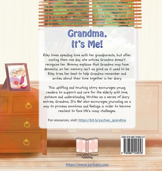 Riley loves spending time with her grandparents, but after visiting them one day, she notices Grandma doesn't recognize her. Mommy explains that Grandma may have dementia, so her memory isn't as good as it used to be. Riley tries her best to help Grandma remember and writes about their time together in her diary. This uplifting and touching story encourages young readers to support and care for the elderly with love, patience and understanding. Written as a series of diary entries, Grandma, It's Me! also encourages journaling as a way to process emotions and feelings in order to become resilient to face life's many challenges. An Activity Pack (including reading comprehension questions, project ideas, templates, coloring pages and more) is also available for download at https://bit.ly/yychan_grandma Foreword by Teresa B.K.Tsien (Gerontologist Hong Kong Alzheimer's Disease Association Board Member) "...The story was written with a dash of humor and lots of love from a child's perspective. It helps to take away some of the mystery, and reminds us that even though the disease has changed the mind and body, the person with dementia is still there, and still loves us. She has illustrated an important message that people with dementia might not remember the events, but they will always remember the feelings that they experienced... I highly recommend this book to families and schools." Recommended and Endorsed by Dementia and Alzheimer's Professionals and Families on the Dementia Journey "A very sweet way to present the challenges a loved one faces when someone dear to them is going through this disease. I found that many aspects of dementia / Alzhei- mer's were touched upon. I see this process every day in my profession. One of my very favorite sayings is "to love them through it". This is a shining example of doing just that-loving someone through it." - Cindy Swanda LPN Memory Support Director, Fremont, Nebraska, USA "... The book has been a blessing for me-I think for the past two years taking care of my mom, I sometimes have a picture in my mind that is full of grey-and oh so dreary! This has lifted my spir- it up and I find that nowadays, even when I think of my mom, the picture has become more colorful." - Serene Low, Singapore Five Star Reviews from Readers' Favorite "... Grandma, It's Me! A Children's Book about Dementia, is a caring, compassionate way to teach young readers about memory loss and how they can help... Young readers will certainly connect with Riley's feelings as she deals with a difficult and confusing situation affecting someone she loves. The power of love shines through this touching story. Beautifully told." - Emily-Jane Hills Orford for Readers' Favorite "... This book offers so many wonders in learning about the journey of loved ones living with dementia or Alzheimer's and those who care for them... I loved this book and highly recommend it for young and old alike." - Vernita Naylor for Readers' Favorite