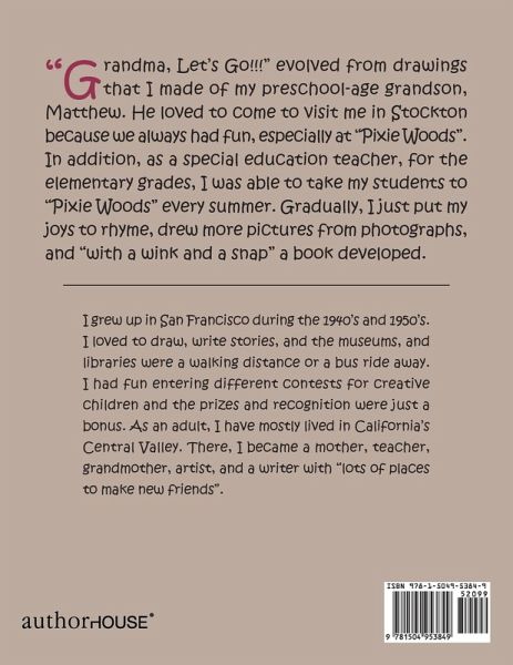 "Grandma, Let's Go!!!" evolved from drawings that I made of my preschool-age grandson, Matthew. He loved to come to visit me in Stockton because we always had fun, especially at "Pixie Woods". In addition, as a special education teacher, for the elementary grades, I was able to take my students to "Pixie Woods" every summer. Gradually, I just put my joys to rhyme, drew more pictures from photographs, and "with a wink and a snap" a book developed.